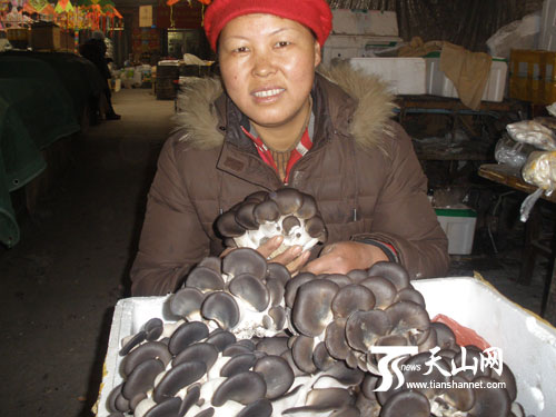3月15日,新疆生产建设兵团农八师一四七团赵奇正在该团中心农贸市场上销售自己种植的蘑菇。她每年利用冬闲种植2亩大棚,种植鸡腿蘑、金针蘑、平蘑等品种,年收入五万多元。