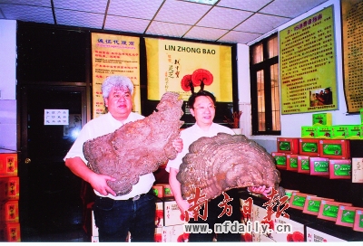 这对奇异的“鸳鸯灵芝”表面为深褐色,呈半月形,厚度有20厘米,半径达50厘米。令人称奇的是,这两扇灵芝表面凹凸相配,可以巧妙地组合在一起,的确是名副其实的“鸳鸯灵芝”。林中宝总裁王碧光是当年野生“鸳鸯灵芝”的发现者,可谓是与灵芝有千年之约的人。上世纪90年代,他北上大别山开辟“灵芝种植基地”,当时的大别山深处有许多地方还未通车,一行数十人便跋山涉水,寻找种植灵芝最佳的地方。忽然,在转角的一株千年古松下,人们发现在树上长着两朵特大灵芝,摘下一称,两株灵芝竟重达50公斤。