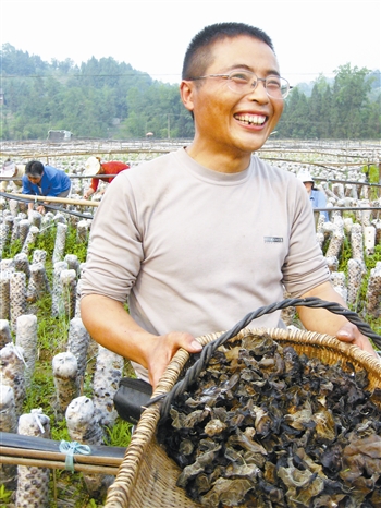 5月17日,在四川宣汉县双河镇尖山村的黑木耳种植基地,农民黄明聪正在收获成熟的黑木耳。四川省宣汉县结合川东高山富硒等特点,大力引进推广新型农业科技,利用水稻空闲期袋装种植黑木耳,助农增收每亩上万元。