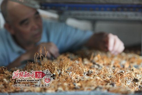 日前,记者在西许营村见到了张振民。张老汉告诉记者,2001年,他在报刊中得知冬虫夏草有着极高的药用和食用价值,想买点当做保健之用。但是一问发现野生冬虫夏草价格高得惊人。“冬虫夏草野也是一种植物,能不能自己养殖呢?”张振民从此开始研究冬虫夏草的养殖方法。十年来,他以蚕蛹为培养基,然后在蚕蛹上滴入经特殊方法培育的菌种,然后将原材料放入瓶中,用塑料薄膜封闭瓶口。经过一段时间培育,白色的菌丝生长出来。待成熟后,再将蚕蛹和菌丝从瓶中取出,放到暗室内阴干,之后就可以制作出虫草酒、虫草茶等制品。