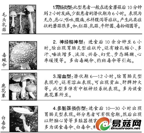 上午,朝阳医院职业病与中毒科郝凤桐主任表示,不同毒蘑菇所含毒素不同,引起的中毒表现也各不相同,毒蘑菇的中毒类型主要有四种(见右图)。“很多时候人们都将蘑菇中毒与食物中毒相混淆,其实蘑菇中毒后如果抢救不及时,是可以致命的。”郝凤桐主任说,毒蘑菇又称毒蕈,在城市中有毒蘑菇比较少见,在山区等地自行采摘野生蘑菇中毒的几率较大。