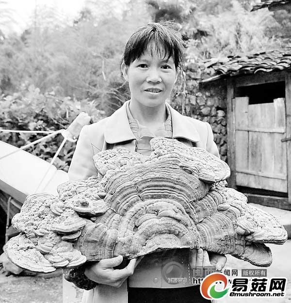 福建龙岩连城县赖源乡黄宗村有万亩竹林和几十种珍贵树种。27日记者在该村采访时了解到,该村村民曾福梅上山砍竹时,发现一株百年老树上长有一纸扇状的寄生物,她和丈夫费了好大的劲才把它弄下来,结果发现是一棵野生灵芝,回家一称有30多斤重,实属罕见。记者 郑秋生 摄