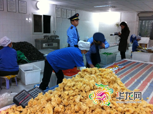 这家名为重庆辽宇食品的企业位于大渡口区八桥镇互助工业园内。早上10点,记者跟随工商人员进入企业分装车间,红白蓝塑胶布铺在距地面不足半米的水泥台上,银耳、黑木耳、香菇等各种干货散堆在一旁。一名女工带着白色帽子、口罩坐在白色的银耳堆前,将银耳装进印有“通江银耳”字样的包装袋中。