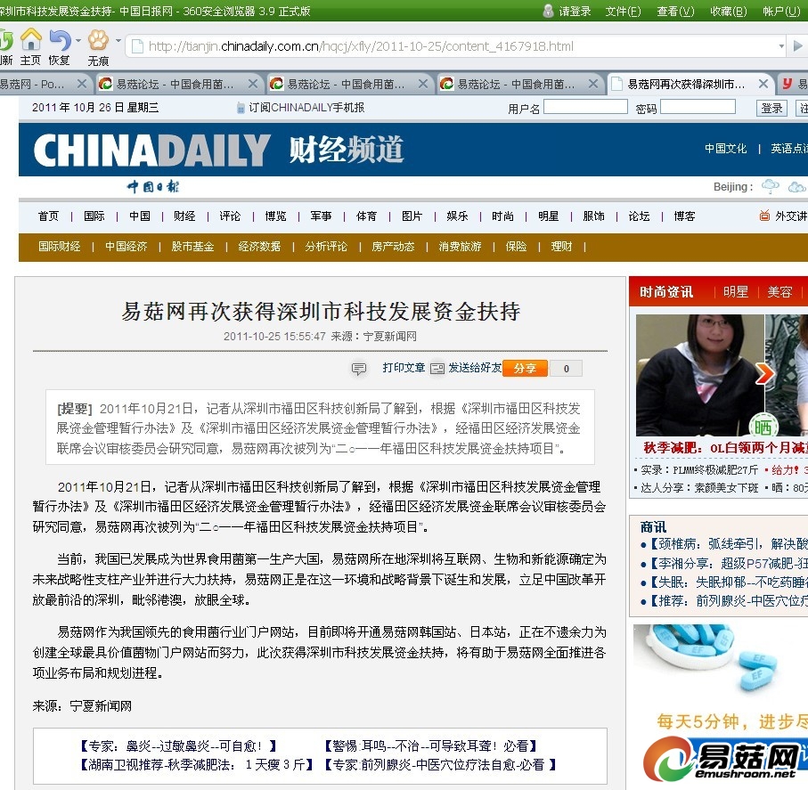 2011年10月21日,记者从深圳市福田区科技创新局了解到,根据《深圳市福田区科技发展资金管理暂行办法》及《深圳市福田区经济发展资金管理暂行办法》,经福田区经济发展资金联席会议审核委员会研究同意,易菇网再次被列为“二○一一年福田区科技发展资金扶持项目”。