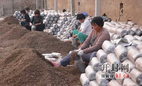 11月8日下午,开封市禹王台区南郊乡东柳林村农民正在装填料袋进行蘑菇种植。据了解,种植蘑菇为该村村民带来了较好的经济效益。 本报记者 李俊生 摄