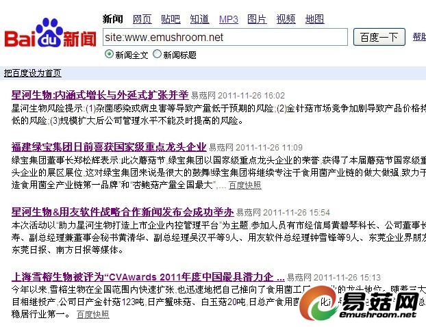 2011年11月24日,易菇网成为全球最大中文搜索引擎百度(Baidu.com)新闻源提供媒体。易菇网被“百度新闻源”收录,标志着易菇网作为Manbetx体育手机版推荐A9版本行业门户网站,在提供ManBetX体育新闻Manbetx体育手机版推荐A9版本方面得到了百度方面的充分肯定和高度认可。