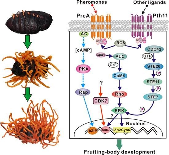 据易菇网了解,能够感染杀虫的真菌种类达1000多种,主要为子囊菌。以绿僵菌和白僵菌等为代表的昆虫病原真菌已被开发为环境友好的真菌杀虫剂;以冬虫夏草和蛹虫草(又称北虫草、北冬虫夏草)等为代表的昆虫病原真菌具有良好的医药保健功能。进化基因组分析表明蛹虫草的出现较绿僵菌早约1.3亿年,各自独立进化而具有杀虫特性,但表现出协同进化的特点,即与其他真菌相比,蛋白酶和几丁质酶等用于昆虫体壁降解的蛋白质家族表现出明显的扩张现象。基因组分析表明,蛹虫草基因组大约有16%的编码基因参与真菌—昆虫的相互作用,不存在编码对于人类有害的已知真菌毒素。首次表明蛹虫草有性生殖类型为异宗配合,但单交配型菌株能够结实。高通量转录组分析表明,与其他真菌不同,其子实体发育主要受MAPK信号途径调控,而非MAPK和PKA共同调控。