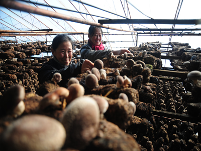 12月4日,海林市菌业种植基地大棚里,农民正在采摘香菇。