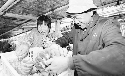 生产基地。图为冀屯镇益三村群众正在大棚内采摘平菇。