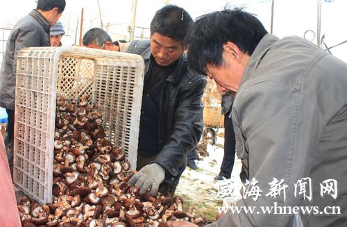 新年临近,文登市大水泊镇洪家庄村香菇基地的菇农们忙着采摘香菇,丰富节日市场。目前香菇收购价每斤为3.5元左右,较此前有所上涨。图为12月20日该村菇农正在分捡新采摘的香菇准备出售。(记者 张虎林 摄)