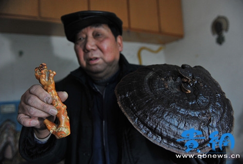 徐大爷在展示祖传的灵芝和奇石