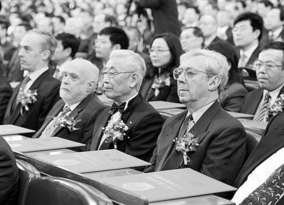 图右一为2011年度国际科技合作奖获得者约翰·巴士威教授。新华社记者 马占成摄