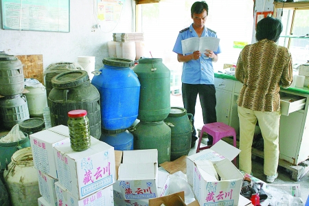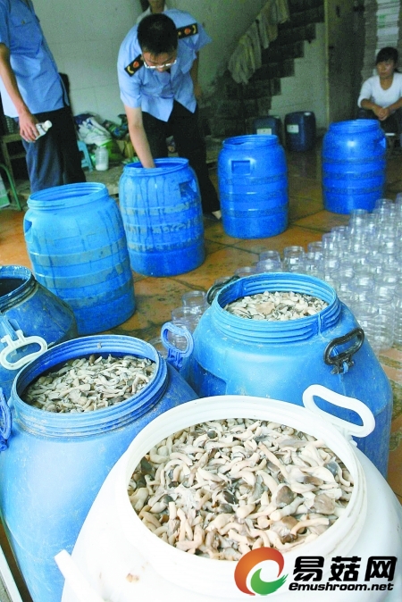 工商人员在查处问题蘑菇的分装现场