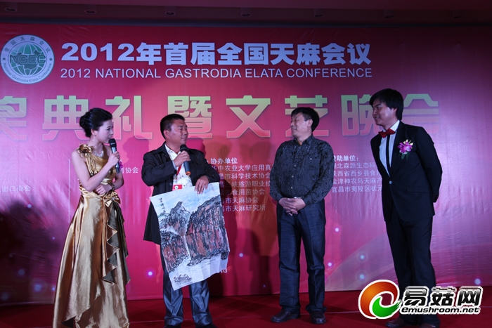 12日晚,全国天麻会议颁奖典礼暨文艺晚会邀请了三峡电视台知名节目主持人王姿领衔主持。颁奖典礼中,先后颁授了“2012年首届全国天麻会议”突出贡献奖、“2012年首届全国天麻会议”指定产品、全国天麻生产先进工作者、全国天麻生产先进单位、全国天麻生产先进县(基地),其中,还特别颁授原中国医学科学院药用植物研究所徐锦堂教授、原中国科学院昆明植物研究所周铉教授为“中国天麻研究终生成就奖”,宜昌三峡旅游职业技术学院王绍柏教授为“全国天麻产业发展突出贡献奖”,对这些在我国天麻科研和生产中作出卓越贡献的专家予以表彰。