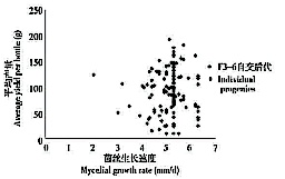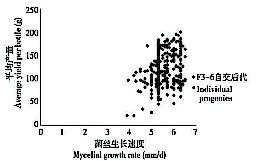 图1F3-6自交后代菌丝生长速度与子实体平均产量相关性Fig.1Mycelialgrowthrateversusaveragefruit