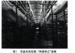 双盖双架双膜-“网屋脊式”菇棚(“网屋脊式”菇棚,中间为水泥通道,两边为菌包架