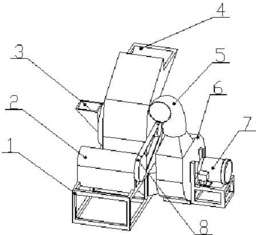 .机架;2.电机;3.第一喂料口;4.第二喂料口;5.风引出料口;6.出料风机;7.风引电机;8.三角带三维示意