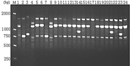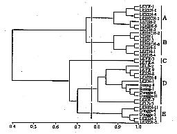 【摘要】采用简单序列重复区间扩增多态性(Inter–simplesequencerepeat,ISSR)技术,利用13个引物对26个安徽野生香菇Lentinulaedodes菌株和6个香菇栽培品种进行了遗传多样性分析,构建了遗传相关聚类图,并根据ISSR分析选择遗传距离远近不同的亲本进行组合杂交,评价了其杂种优势。在78个ISSR标记中,多态性标记为61个,占78.2%。聚类分析显示,当以相异距离0.23为阈值,32个菌株被划为5个ISSR遗传组,多数菌株之间遗传相似性较低。这表明供试菌株在DNA水平上存在比较显著的遗传变异,具有较丰富的遗传多样性。杂种优势的检测表明亲本间遗传距离较大的组合其杂种优势也较强。