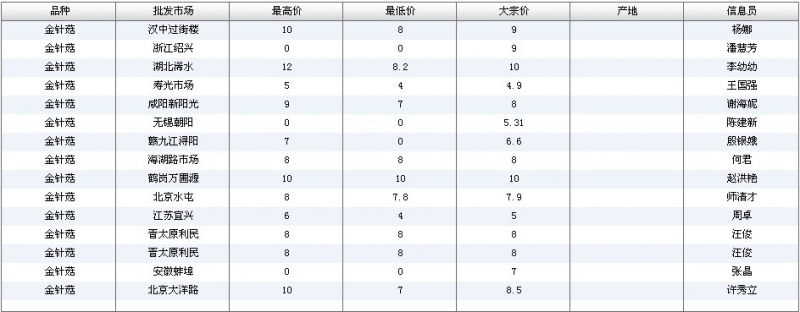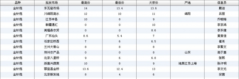 2012.04.18 金针菇全国批发市场价格行情 单位(元/公斤) 来源:全国农产品批发市场价格信息网