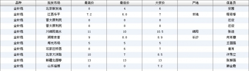 2012.04.20 金针菇全国批发市场价格行情 单位(元/公斤) 来源:全国农产品批发市场价格信息网