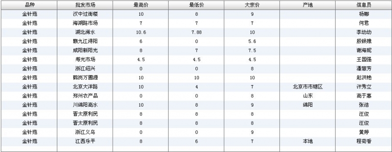 2012.04.23 金针菇全国批发市场价格行情 单位(元/公斤) 来源:全国农产品批发市场价格信息网