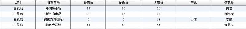 2012.05.11 白灵菇全国批发市场价格行情 单位(元/公斤) 来源:全国农产品批发市场价格信息网