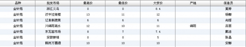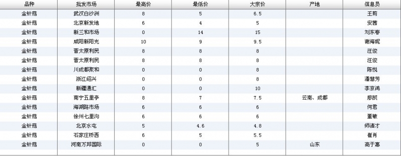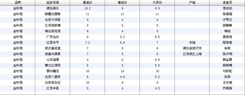 2012.05.24 金针菇全国批发市场价格行情 单位(元/公斤) 来源:全国农产品批发市场价格信息网