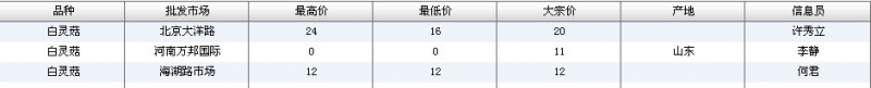 2012.05.30 白灵菇全国批发市场价格行情 单位(元/公斤) 来源:全国农产品批发市场价格信息网