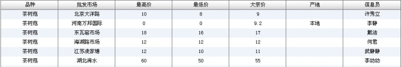 2012.05.30 茶树菇全国批发市场价格行情 单位(元/公斤) 来源:全国农产品批发市场价格信息网