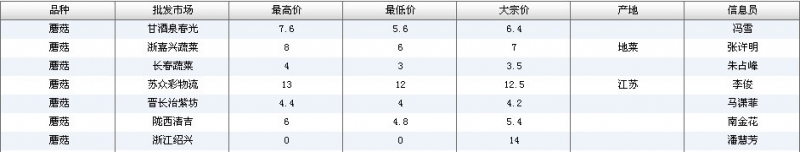 2012.06.01 蘑菇全国批发市场价格行情 单位(元/公斤) 来源:全国农产品批发市场价格信息网