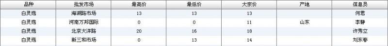 2012.06.05 白灵菇全国批发市场价格行情 单位(元/公斤) 来源:全国农产品批发市场价格信息网