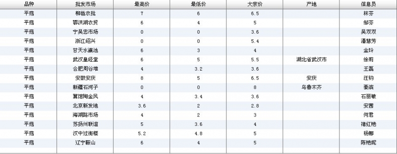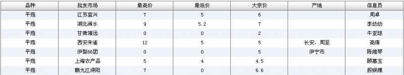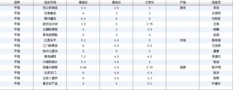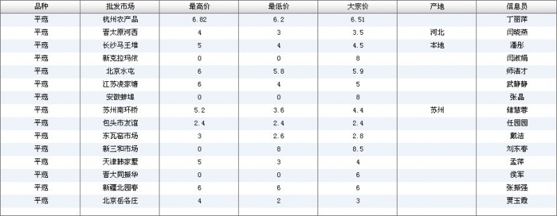 2012.06.06 平菇全国批发市场价格行情 单位(元/公斤) 来源:全国农产品批发市场价格信息网