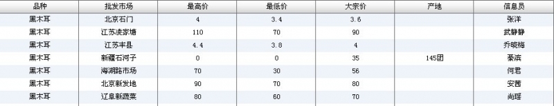 2012.06.06 黑木耳全国批发市场价格行情 单位(元/公斤) 来源:全国农产品批发市场价格信息网