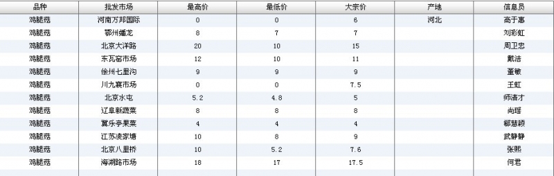 2012.06.13 鸡腿菇全国批发市场价格行情 单位(元/公斤) 来源:全国农产品批发市场价格信息网