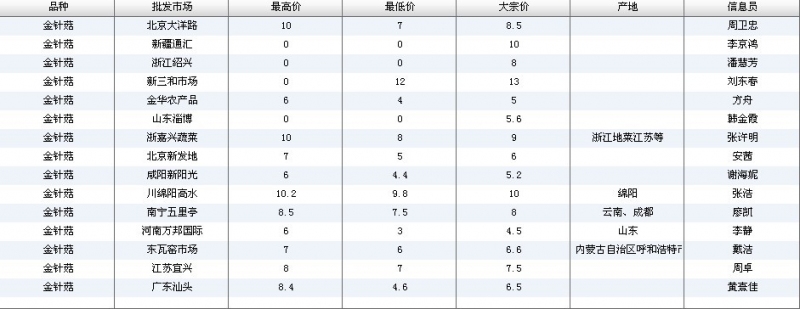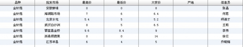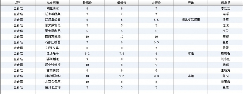 2012.06.20 金针菇全国批发市场价格行情 单位(元/公斤) 来源:全国农产品批发市场价格信息网