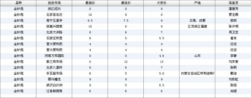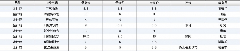 2012.06.29 金针菇全国批发市场价格行情 单位(元/公斤) 来源:全国农产品批发市场价格信息网