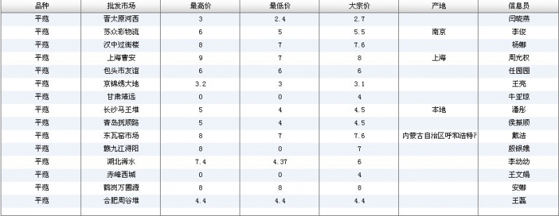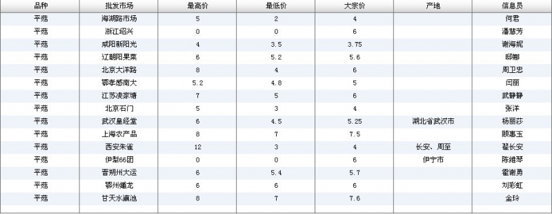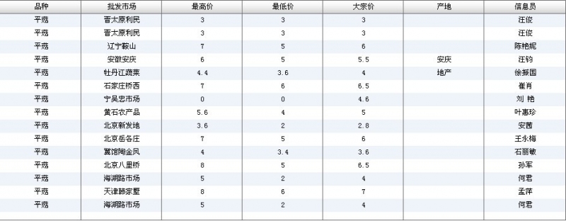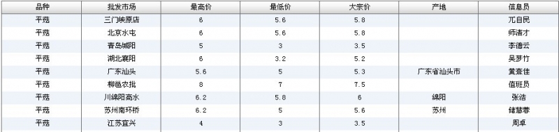 2012.06.30 平菇全国批发市场价格行情 单位(元/公斤) 来源:全国农产品批发市场价格信息网