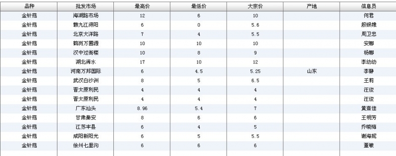 2012.07.03 金针菇全国批发市场价格行情 单位(元/公斤) 来源:全国农产品批发市场价格信息网