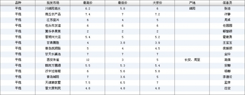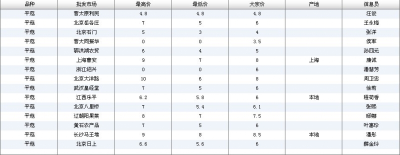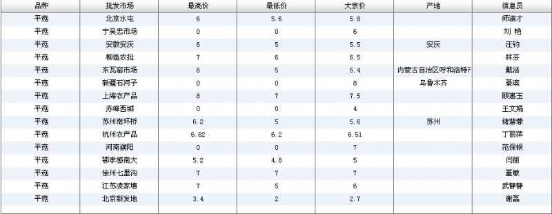 2012.07.05 平菇全国批发市场价格行情 单位(元/公斤) 来源:全国农产品批发市场价格信息网