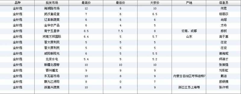 2012.07.06 金针菇全国批发市场价格行情 单位(元/公斤) 来源:全国农产品批发市场价格信息网
