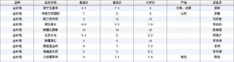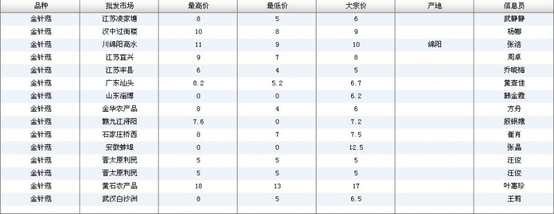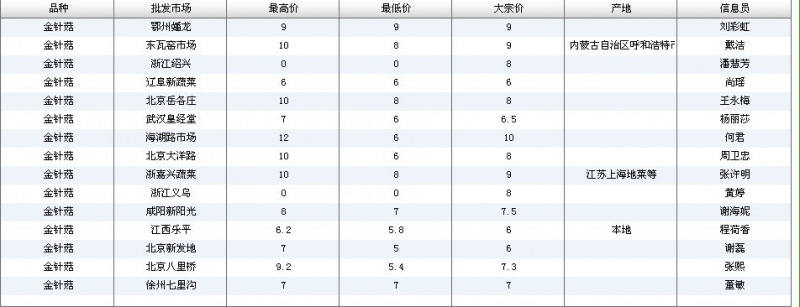 2012.07.10 金针菇全国批发市场价格行情 单位(元/公斤) 来源:全国农产品批发市场价格信息网