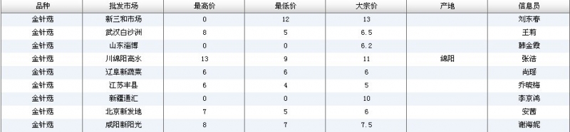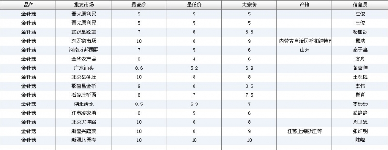 2012.07.11 金针菇全国批发市场价格行情 单位(元/公斤) 来源:全国农产品批发市场价格信息网
