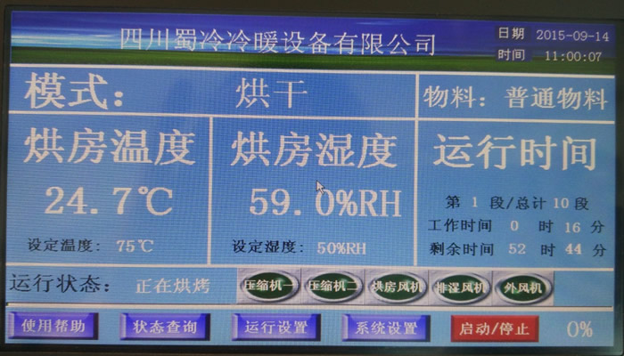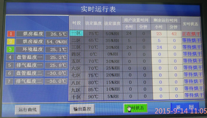 利用湿度传感器,监测烘房内部湿度,机组可采用温度、湿度、时间、温度+时间等方式来控制排湿开启,如设定50度,排湿温差5度,那么45度开始排湿,排到40度即停止,湿度跟温度类似;时间控制列如设定为每次间隔5分钟排湿,每次排1分钟,同样是可以跟着温度曲线设定不同的排湿参数。