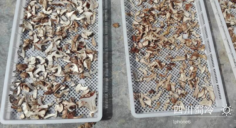 3、菇面呈白色或灰白色的菇,可以把菇面向上平放在菇筛上,用干净喷雾器均匀轻喷清水于菇面上(不能喷在菌褐上),再放进烘干房,关闭门窗,闷30分钟,再进行正常烘干。一次不行可进行2—3次,这样菇面颜色一致。