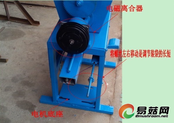 6.套上菌袋(最好先在料筒上抹些水,以便于套袋),同时往料斗里装菌末,一般第一次装满为宜。松开脚踏离合,机械开始工作。本机械松紧可自行调节,共4档。菌袋装满后会停止工作,用脚踏离合使其自动落袋,方便快捷。以此进行工作。