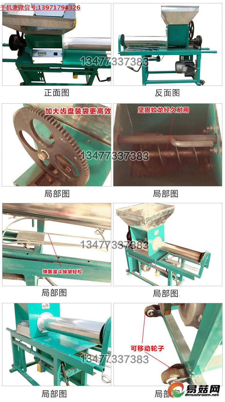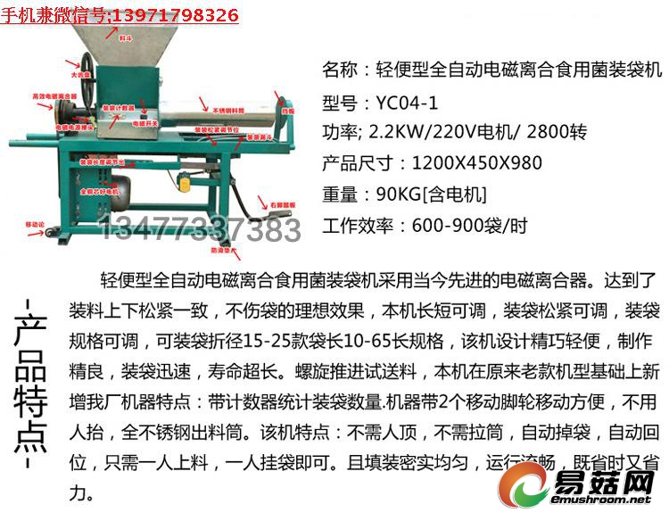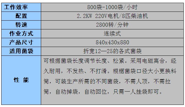 该机采用电磁离合技术,离合器经久耐用,二十万袋无大修,袋子松紧,长短可调节,根椐菌袋大小更换料筒。该机特点:不需人顶,不需拉筒,自动掉袋,自动回位,只需一人挂袋即可。