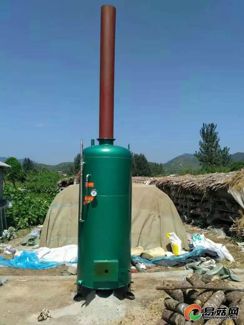 九、把常压灭菌锅炉放到距菌垛一米左右的地方,在锅炉底部垫两层砖,其意是抬高锅炉,利于通风和清除炉渣。然后把蒸汽导管接好,一头插进菌垛底部(木杠以下),不要插进去太深,以20cm-30 cm为宜。要注意使导汽管口平伸,不要向上跷或向下跷。