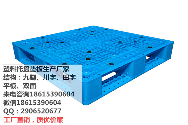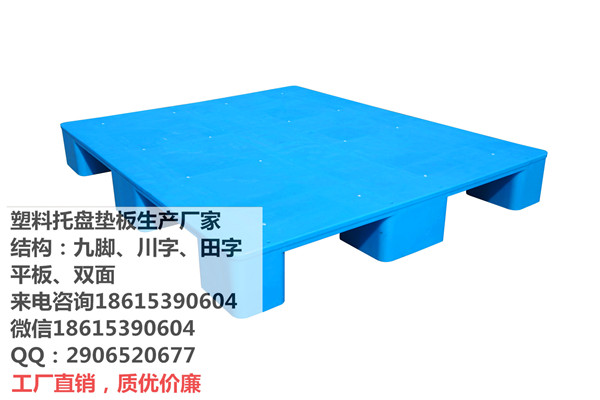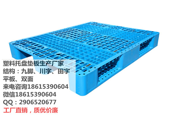 包装厂塑料托盘价格单面川字货架塑料托盘厂家规格有:1200×1200×160mm 1300×1100×160mm 1200×1000×160mm 1100×1100×160mm 等,动载:800kg--1500kg 静载:2000kg--4000kg 单面川字塑料托盘主要适合于手动液压人力拖车,方便人工搬运。特别是食品企业、制药企业内部环境卫生要求高,不能使用燃油叉车,以免造成室内卫生的污染。单面川字塑料托盘可根据客户使用条件在托盘内部穿加钢管以提高塑料托盘的动载性能以及货架载重性能。 川字底塑料托盘面部加4根钢管以及底部三条腿各加2根钢管,整块托盘加10根钢管(一般企业通常为8根钢管),应用于贯通式、穿梭式立体货架,节省仓储空间,机械叉车操作大大提高工作效率。