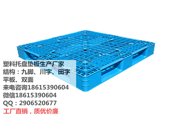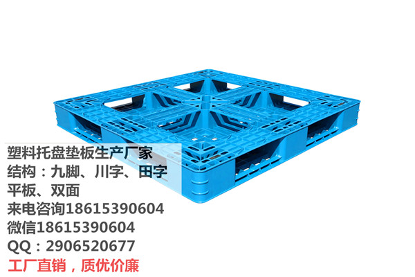 田字底塑料托盘厂家单面九脚仓储塑料垫板规格有:1200×1000×140mm 1100×1100×140mm 1200×800×140mm 1100×800×140mm 1000×800×140mm等,单面九脚底托盘由于自重轻,结构简单主要适用于仓库铺垫使用。根据码放物品及包装大小偶尔手动人力液压拖车(地牛)和机械叉车,田字底塑料托盘动载:800kg--1500kg 静载:2000kg--4000kg 一般为纸箱厂、制药厂、食品厂、服装厂、电子电器件企业垫仓。田字底塑料托盘无论在哪个行业都离不开塑料托盘的应用,在食品操行业上要使用塑料托盘来堆放物品啊!在农产物大概其他的行业都是云云!都离不开运用塑料托盘,再者就是塑料托盘代价也比力自制,很得当一些大中小企业的运用!且利用起来比力方便,同样可以根据客户的要求生产出差别品种的样品以供参考!