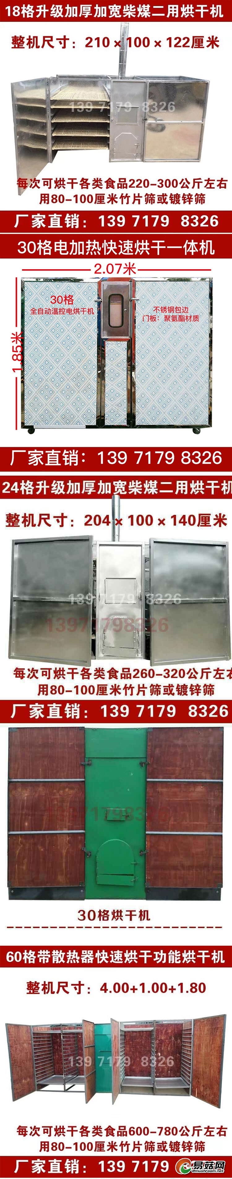 30号机器外形尺寸(长x宽x高):238x100x180装入量:300kg-380kg,烘干时间:6-10小时整套包括主机和两个烘箱,电机已安 装1.1W风扇,两边的烘箱为活动板,客户自己安装)该机价格不含筛子价格,筛子尺寸80*100,分竹片筛和镀锌筛